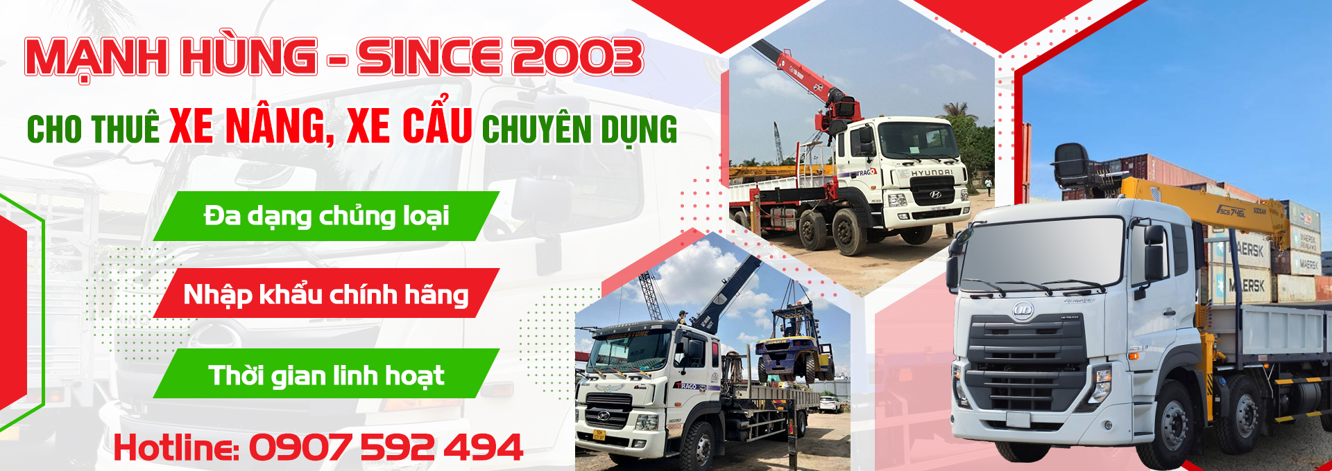 Với nhiều năm hoạt động và phát triển, Vận Tải Mạnh Hùng tự tin là đơn vị đứng đầu chuyên cung cấp, cho thuê xe tải cẩu từ 2.5 tấn đến trên 50 tấn, phục vụ vận tải hàng hóa nặng, container các loại theo yêu cầu của Quý khách